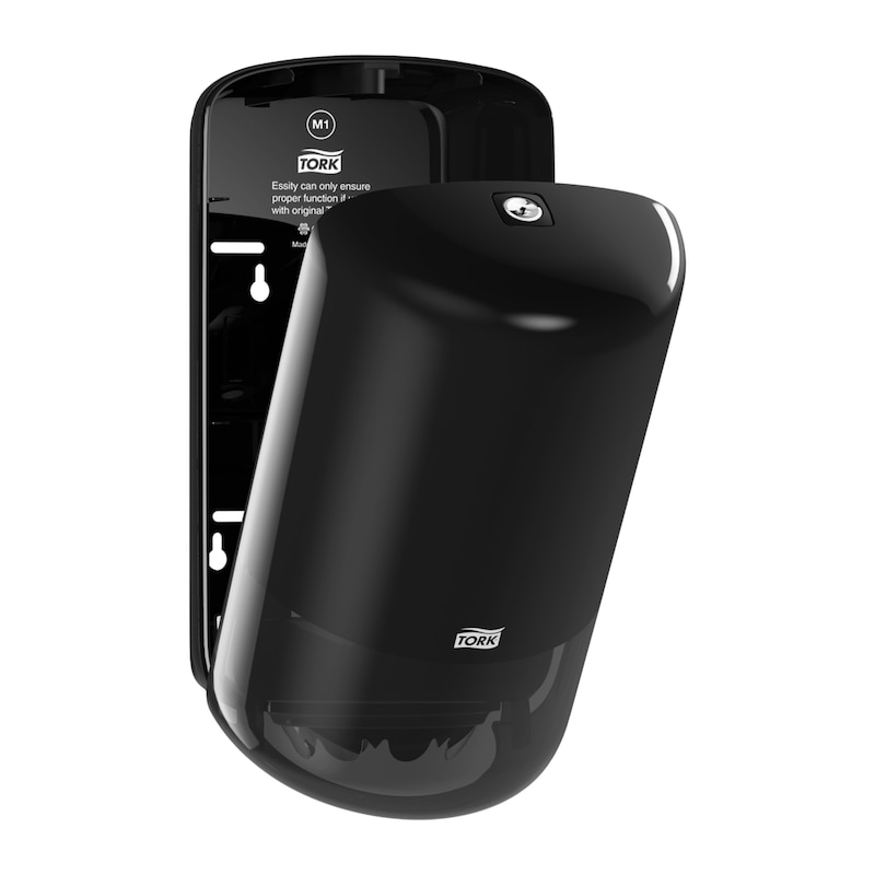 Med sin sorte finish giver Tork M1 Mini dispenseren et moderne og sofistikeret udseende, der passer ind i enhver indretning. Den kompakte størrelse gør den ideel til steder, hvor pladsen er begrænset, samtidig med at den sikrer en problemfri betjening.